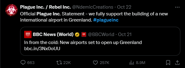 前兩天,遊戲《瘟疫公司》的官方賬號在X轉發了一條新聞——格陵蘭島即將建立新國際機場,並留言表示“全力支持”。