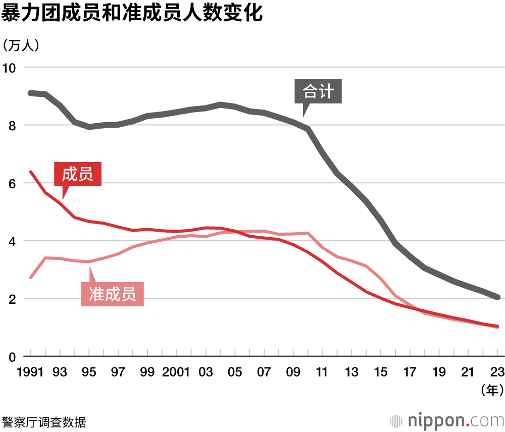 日本警察廳最新公佈的《組織犯罪形勢》報告顯示,截至2023年末,全日本的暴力團成員和準成員只剩下20400人,連續19年減少,創下歷史新低。