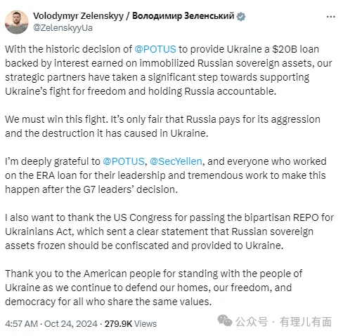 在這場美西方的瓜分中,烏克蘭總統澤連斯基在社交媒體上感謝拜登和耶倫促成此次貸款,稱這是“支持烏克蘭爭取自由的鬥爭和追究俄羅斯責任的重要一步”。