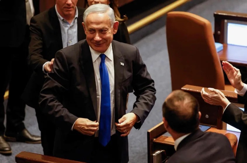 當地時間2022年12月29日,耶路撒冷,以色列總理本雅明·內塔尼亞胡在耶路撒冷的以色列議會宣誓就職時做出反應。內塔尼亞胡在反對黨任職一段時間後宣誓就任總理,領導了被分析人士稱為該國曆史上最右翼的政府。(圖源:視覺中國)