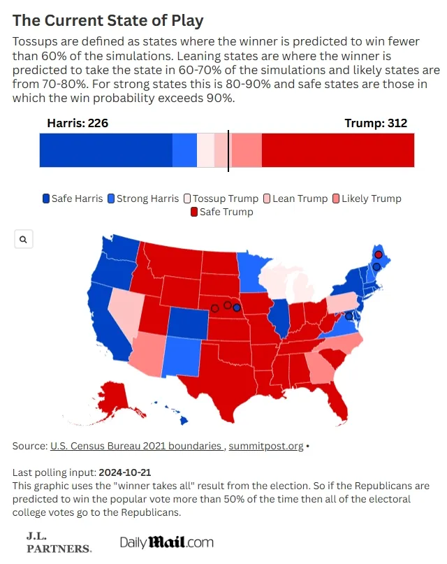 根據《每日郵報》和J.L. Partners的聯合民意調查發現,川普有望獲得312張選舉人票。