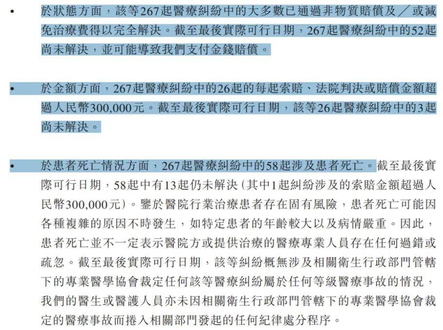 對於醫院來説,最棘手的問題莫過於醫療糾紛以及患者投訴。招股書顯示,截至目前,明基醫院共發生了267起醫療糾紛,大多數已通過非物質賠償或減免治療費得以解決。但仍有52起尚未解決,可能導致公司支付金錢賠償,其中11起患者或其家屬提起的訴訟正在進行中。