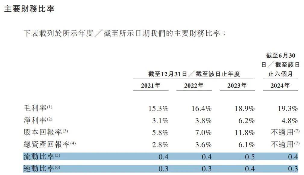 從財務層面來看,衡量企業償債能力一般看流動比率、速動比率等指標。2021年至2023年、2024年上半年,公司的流動比率分別為0.4、0.4、0.5、0.4,速動比率分別為0.3、0.3、0.4、0.3,兩個指標均低於1。這表明企業在短期償債壓力較大。