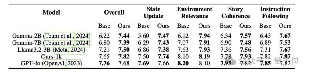 以Gemma-2B為例,經過微調之後的遊戲引擎,在狀態更新、環境相關性、故事連貫性和指令遵循方面都表現得更為出色。