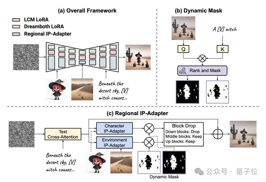 在視覺生成方面,他們引入了新型動態區域圖像提示適配器(Regional IP-Adapter)。該適配器可在保持多幅圖像視覺一致性的同時,生成一致的角色和環境。