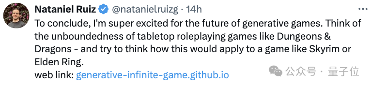 對於這項研究,谷歌導師Nataniel Ruiz興奮表示了對生成遊戲的看好:未來大多數遊戲都將完全由生成遊戲組成。