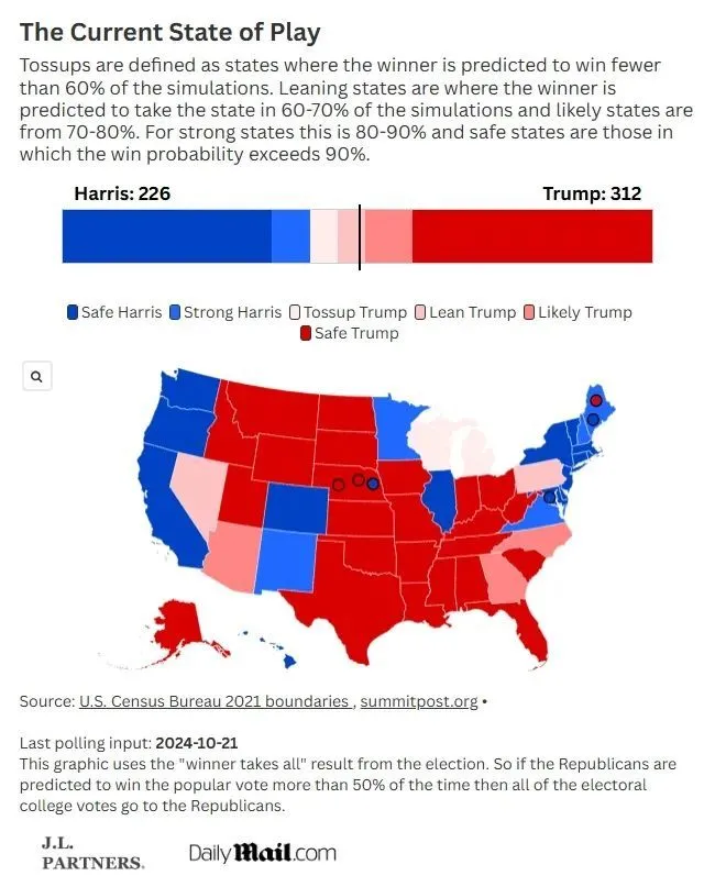 根據《每日郵報》和J.L. Partners的聯合民意調查發現,川普有望獲得312張選舉人票。