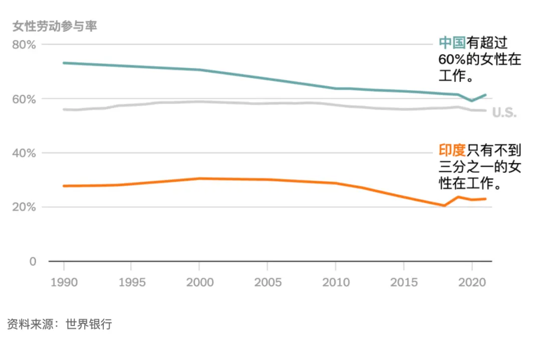 但當前的印度經濟主要依靠服務業,因此能帶動的就業崗位很少。此外,女性居家也是印度的一種文化體現,很多女性在家庭中扮演的是經營者和管理者的角色,而不是具體的家務執行者,因為在中產階級羣體中,很多人家中其實有保姆。許多印度家庭中,丈夫會將收入交給太太管理,太太用這些錢去投資理財,也會負責安排家庭的各項活動。這種模式在美國的一項研究中被稱為“認知付出”,因為統籌這些事情需要進行大量決策並付出心力,一些印度女性也能從這個角色中找到價值感。