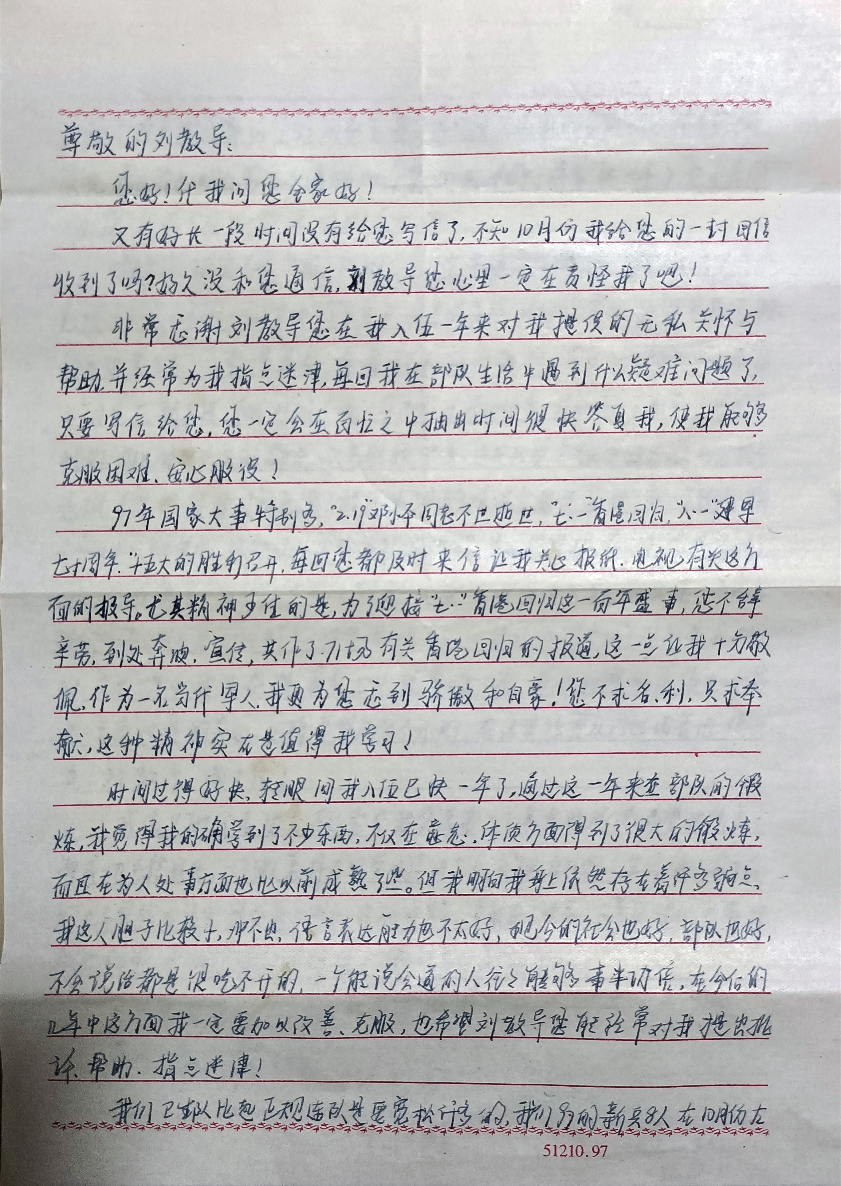 1997年國家大事特別多,2月19日鄧小平同志逝世,7月1日香港迴歸,八一建軍70週年,十五大的勝利召開,每回你都及時來信,讓我關心報紙電視有關這方面的報道。