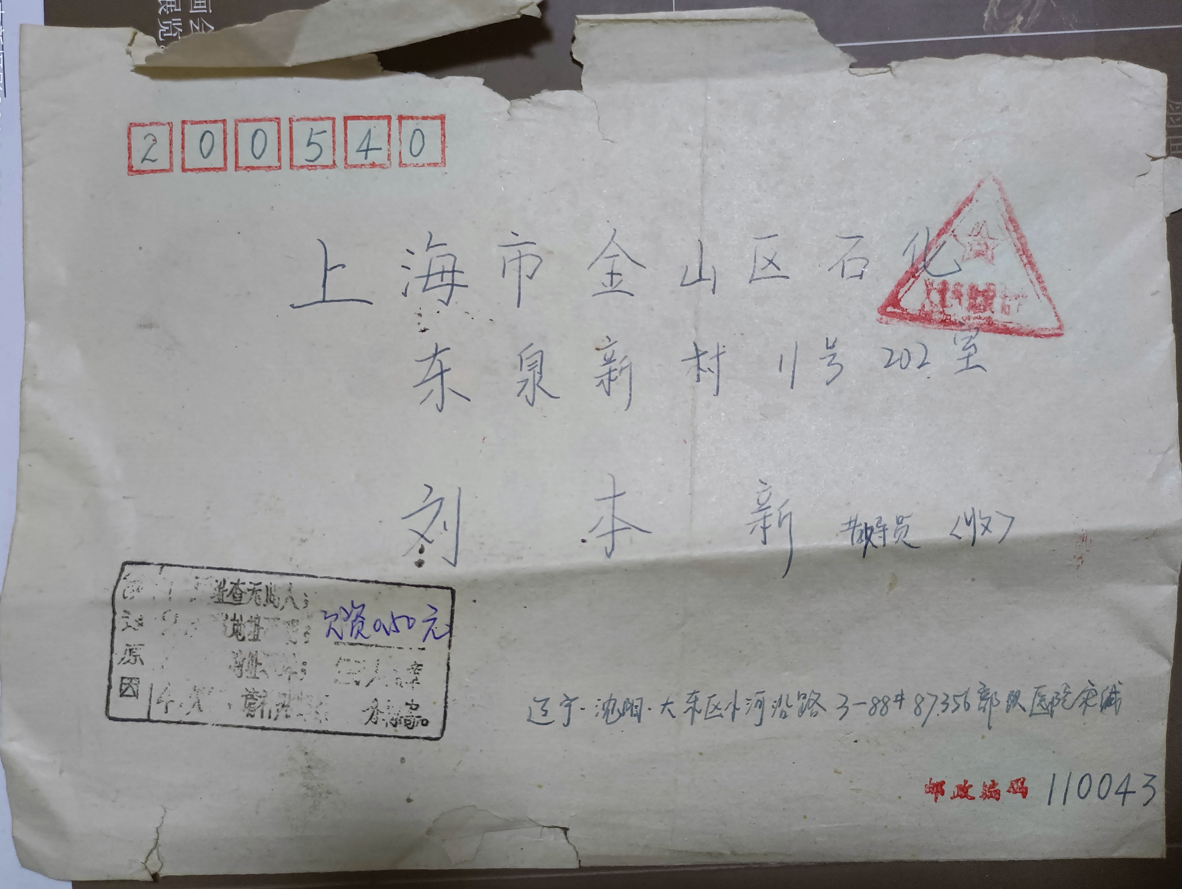 我那時住在上海市金山區石化街道東泉新村11號202室,郵編200540.