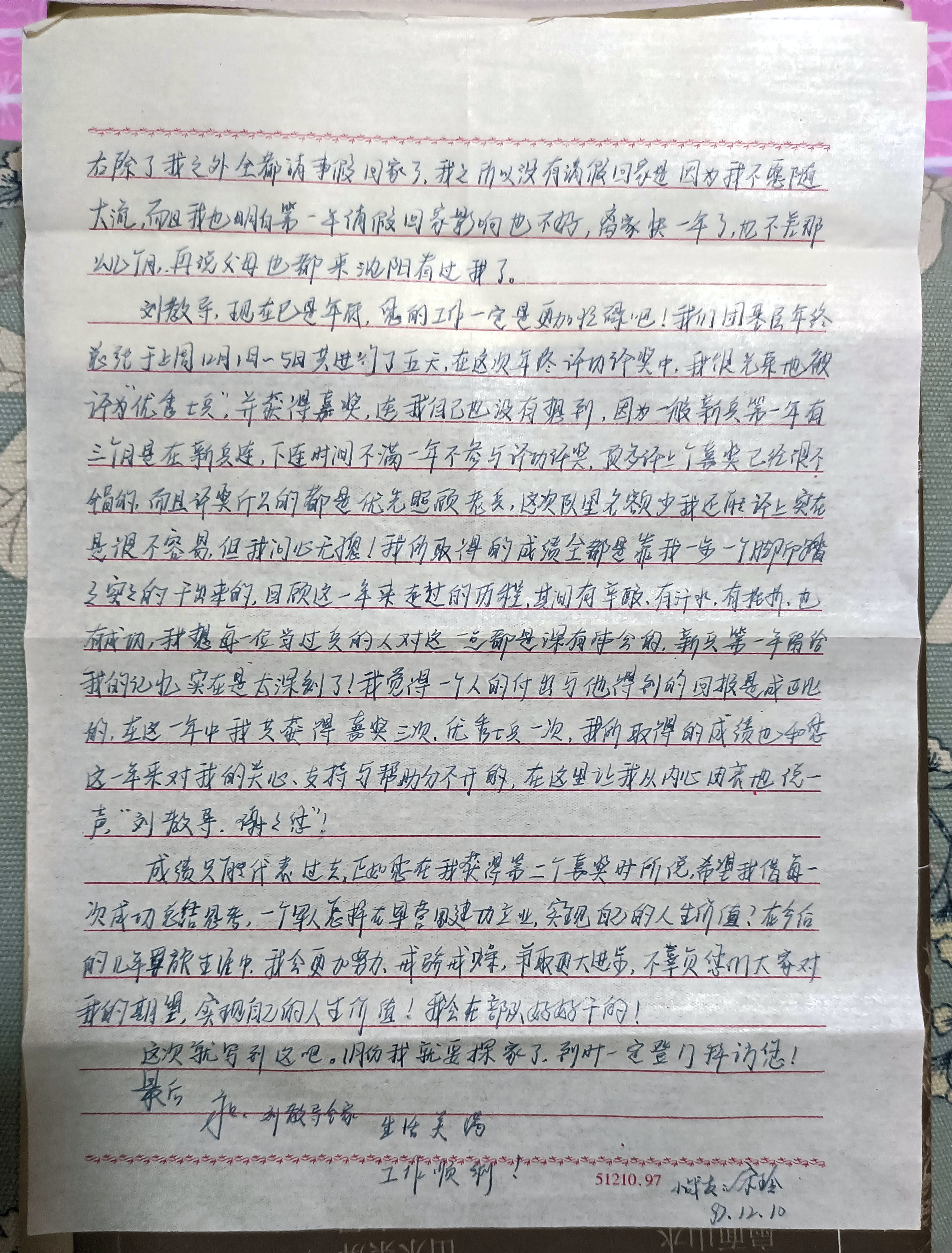1997年12月10日,宋玲給我寫來了熱情洋溢的“入伍一年總結匯報信”,通過這封信我們看到了這位女兵的風采,也看到“故鄉指導員”活動對我軍的重要作用。