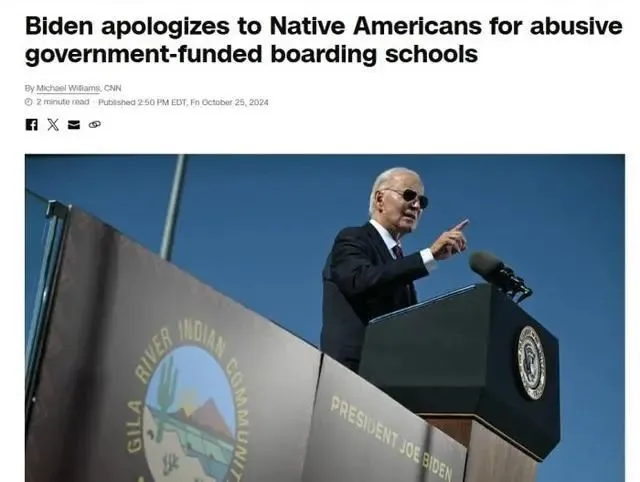當天,拜登表示:“我以美國總統的身份正式為我們的所作所為道歉。”他説,政府強迫原住民兒童離開他們的社區進入寄宿學校“永遠是一個重大的恥辱印記,是美國曆史上的污點”。