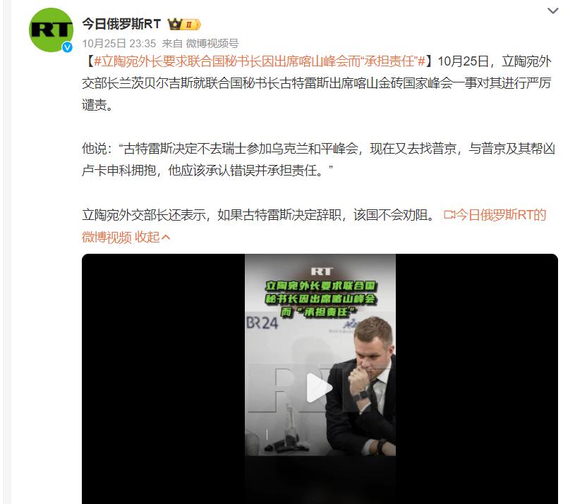 據今日俄羅斯rt報道,10月25日,立陶宛外交部長蘭茨貝爾吉斯就聯合國秘書長古特雷斯出席喀山金磚國家峯會一事對其進行嚴厲譴責。他説:“古特雷斯決定不去瑞士參加烏克蘭和平峯會,現在又去找普京,與普京及其幫兇盧卡申科擁抱,他應該承認錯誤並承擔責任。”