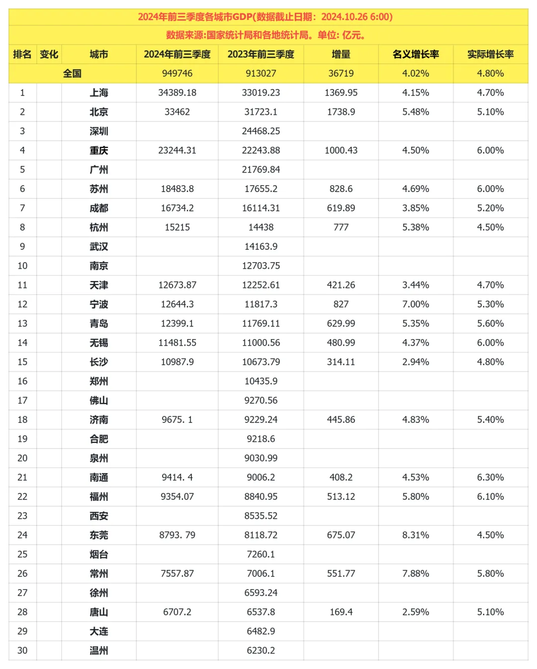 截止2024年10月26日,已公佈城市的前三季度GDP數據(前30名城市)