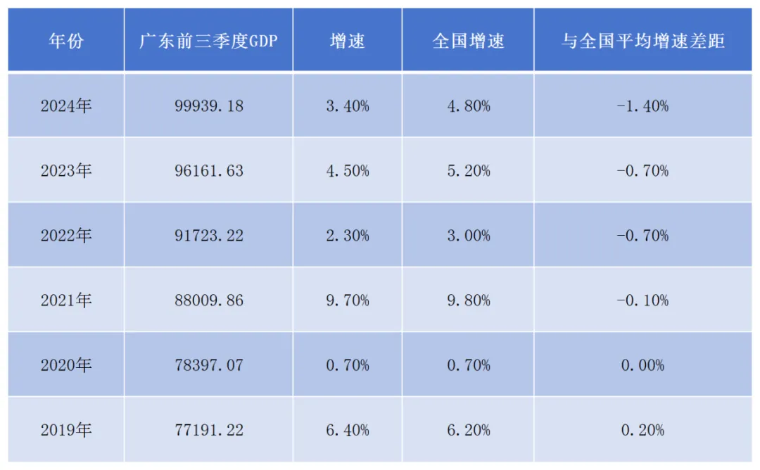 對比2020年到2024年,廣東前三季度的GDP增速分別為0.7%、9.7%、2.3%、4.5%、3.4%,下滑明顯。