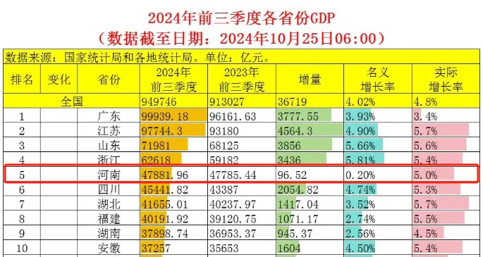 經濟強省的廣東,2024年前三季度GDP99939.18億元,雖然依舊霸榜,可就懸在10萬億的門檻邊,着實有些遺憾。
