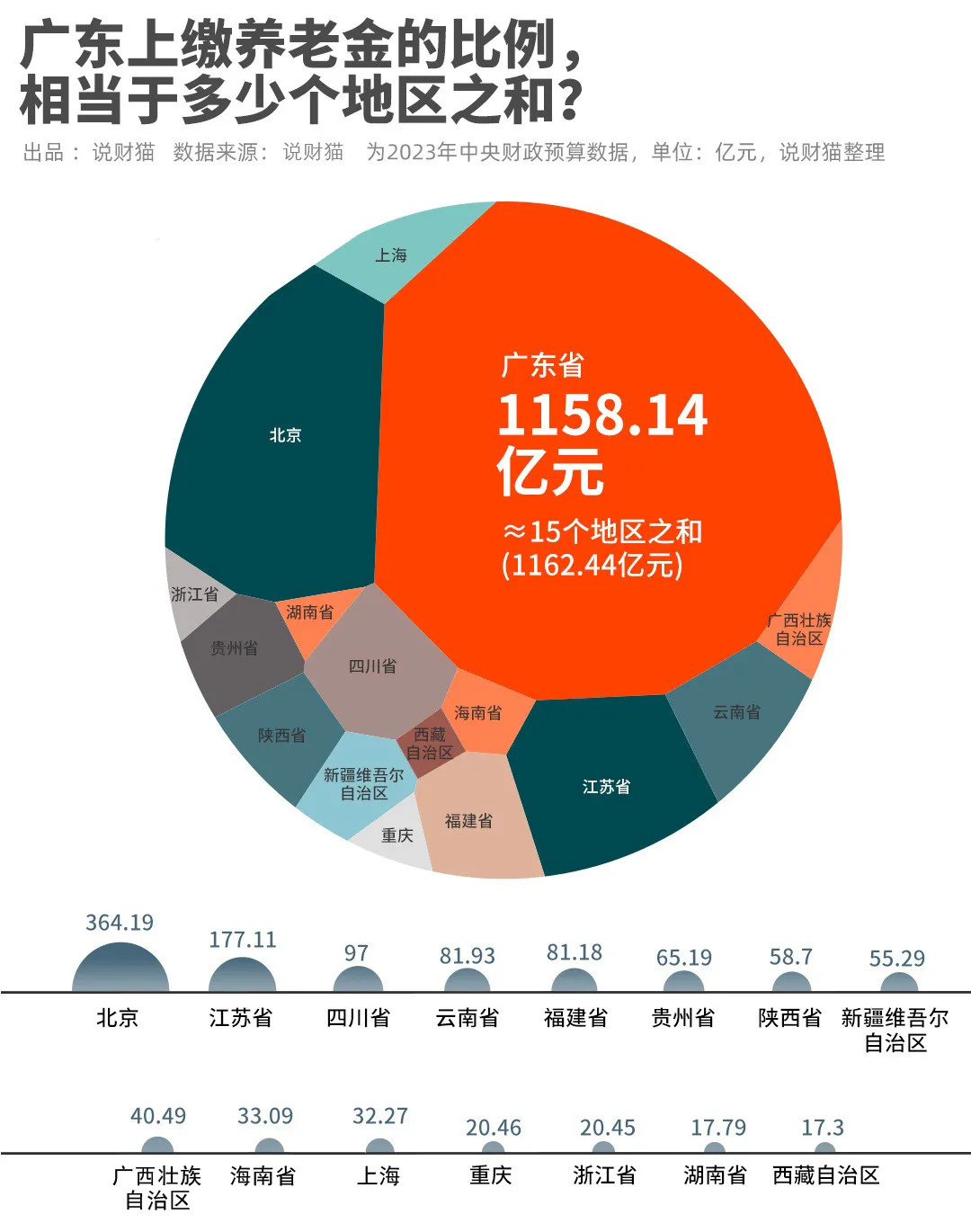 廣東上交養老金比例相當於15個地區的總和。圖片來源:説財貓