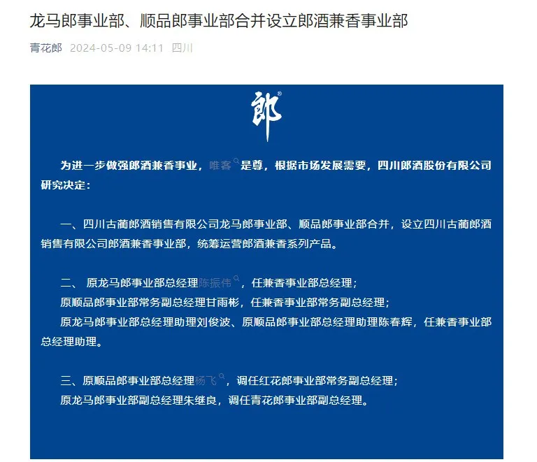 2024年5月份,郎酒將年初由小郎酒事業部升級的順品郎事業部,以及由郎牌特曲事業部升級的龍馬郎事業部合併,並設立郎酒兼香事業部,由該事業部將統籌運營郎酒的兼香產品。