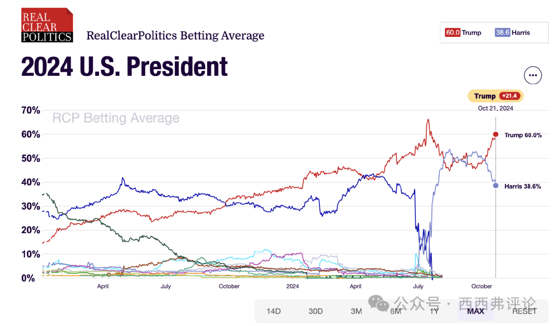 相對中立一點的RCP(Real Clear Polling) 根據賭盤數據,認為特朗普的贏面已經達到了60%。