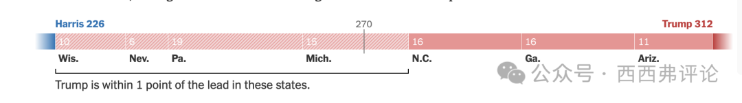 另外一個民主黨喉舌《紐約時報》的民調均值類似,7個搖擺州,哈里斯領先4個,特朗普領先3個。按這個結果,哈里斯276:262取勝。