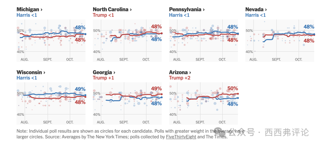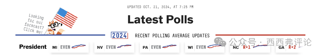 538認為7個搖擺州,北卡佐治亞亞利桑那三個州特朗普領先,密執安內華達賓夕法尼亞威斯康星四個州打平。