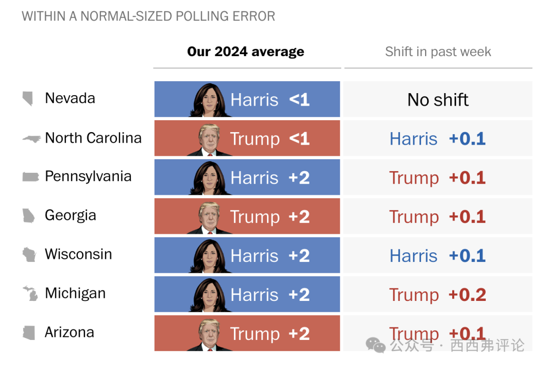 民主黨喉舌《華盛頓郵報》則認為,7個搖擺州,哈里斯仍然領先四個,特朗普只領先三個。按華盛頓郵報的民調均值,哈里斯仍然可以以276:262擊敗特朗普。就算丟掉內華達,還是可以270:268取勝。