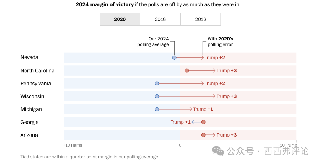 不過《華盛頓郵報》可能也覺得自己的傾向性比較明顯。又補了一個分析。如果民意調查的誤差,和2020年那次大選一樣,特朗普將全取7個搖擺州,大獲全勝。所以還是華盛頓郵報最高明,哈里斯勝利,也是華郵贏,特朗普勝利,還是華郵贏。