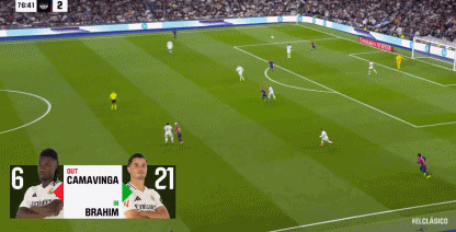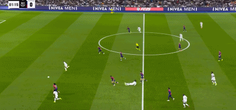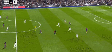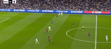 巴薩第三球,對拜仁時就施展過的對角線長傳出球,萊萬和拉菲尼亞交叉跑位,皇馬中路後場輪轉大亂,拉菲尼亞後插上,助攻亞馬爾,“伯納烏安靜”,史上國家德比最年輕的進球人。