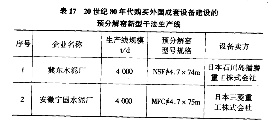 20世紀八九十年代,中國水泥工業利用外資建成一批預分解窯新型幹法生產線,採用國產設備建設了一批日產2000噸熟料生產線,同時利用預分解窯新型幹法技術還改造了一批老水泥企業,使得中國水泥工業的技術水平有了一定的提高。