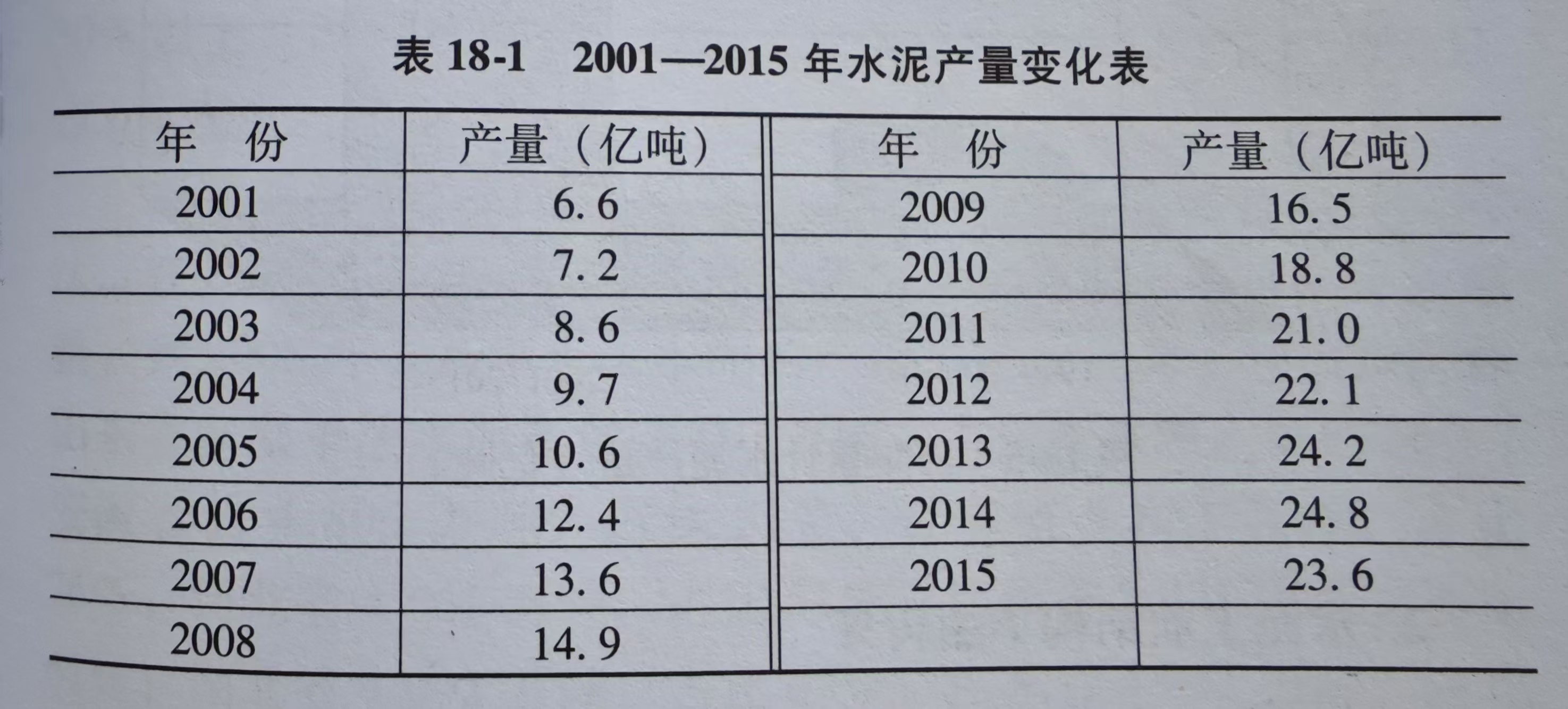 2003年中國水泥產量一年內增加了1.37億噸,創下了中國曆年水泥增量的新紀錄。此後連續9年,中國每年水泥產量增量都超過1億噸,中國水泥產量也從2000年的5.97億噸增加至2015年的23.6億噸,水泥產量佔全球產量的50%以上。