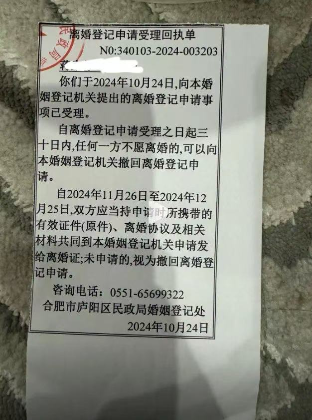 曬出了蓋公章的《離婚登記申請受理回執單》