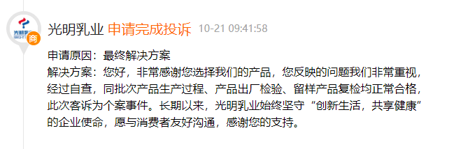 光明乳業回應表示,已關注到相關報道。“光明乳業歷來高度重視產品品質及食品安全工作,公司內部已經完成產品生產工廠自查工作,確認該批次產品在生產過程、產品出廠檢驗、留樣產品複檢等環節排查結果均正常,且同批次產品至今未有相同問題反饋。與此同時,公司重視消費者意見,傾聽消費者需求,並已邀請消費者家人前往產品生產工廠,實地瞭解了產品生產過程。後續光明乳業仍將積極與消費者保持溝通,消除誤解。”
