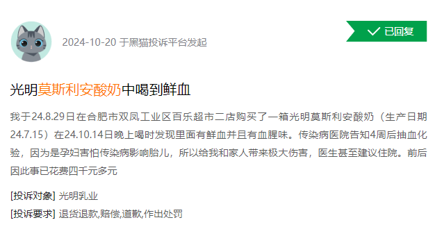近日,一起關於光明乳業莫斯利安酸奶的投訴事件引發了廣泛關注。合肥的一位孕婦消費者在購買並飲用了該品牌酸奶後,發現其中有疑似鮮血的物質,並伴有血腥味。