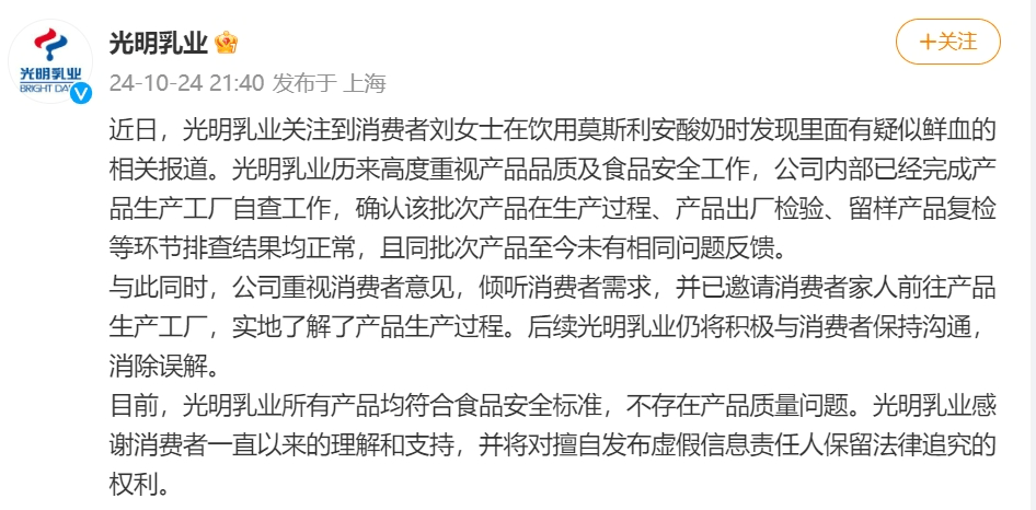 10月24日,光明乳業通過官方微博發佈最新回應表示,所有產品均符合食品安全標準,不存在產品質量問題。