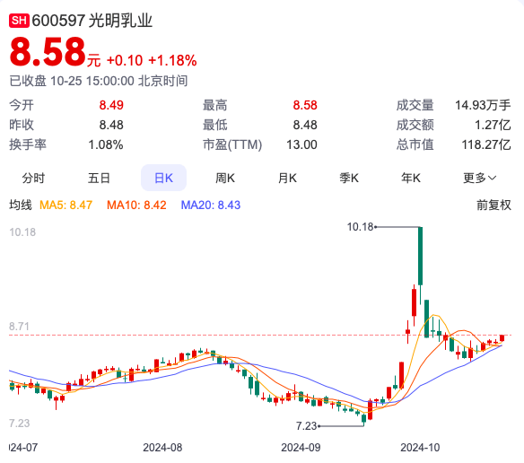 在二級市場上,光明乳業的股價也一直處於震盪下滑狀態。從2020年9月至今,其股價已經下跌了不少。截至最近一個交易日收盤,其股價僅為8.58元/股,總市值約為118億元。這樣的市場表現無疑反映了投資者對光明乳業未來發展的擔憂和不確定性。