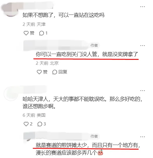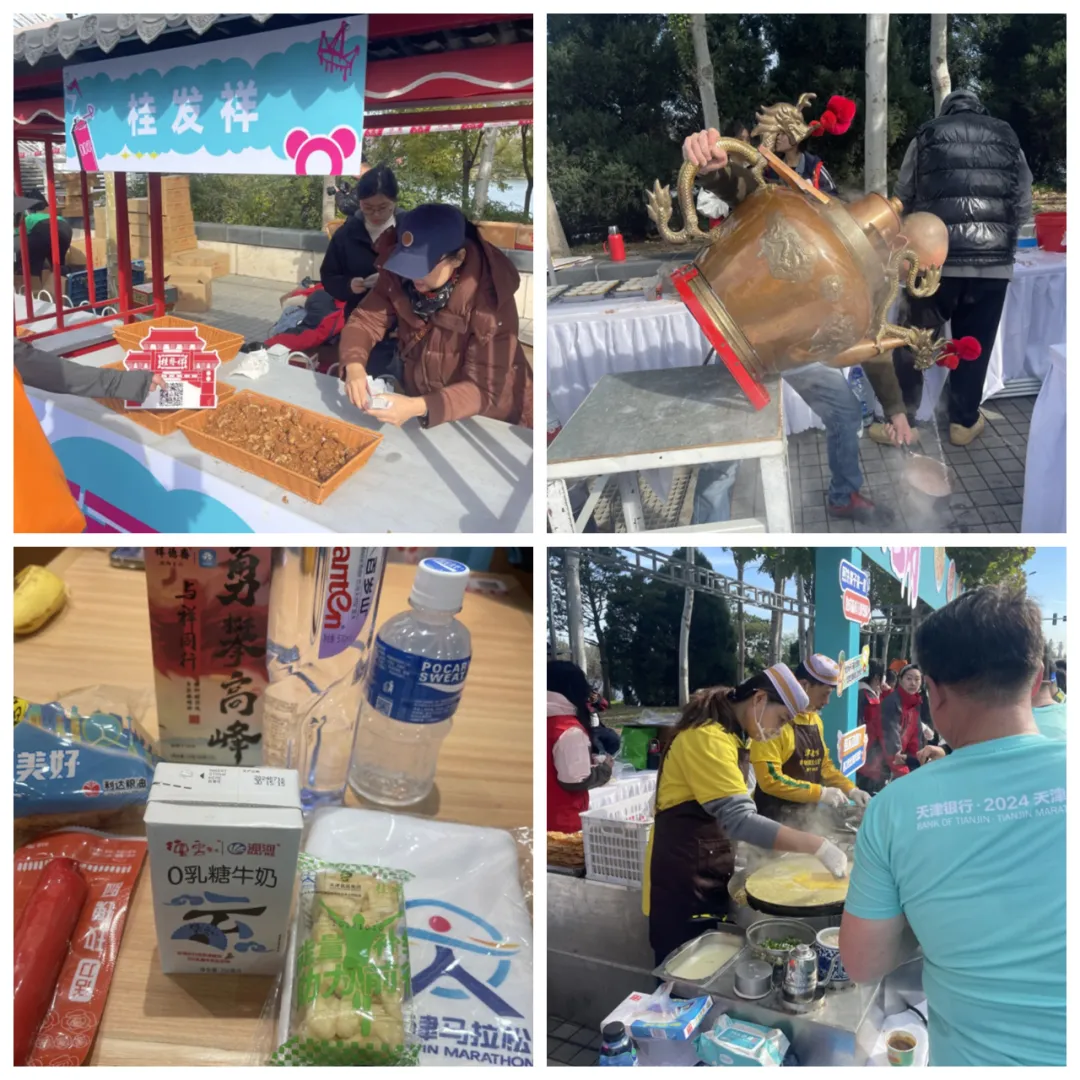 桂發祥和十八街麻花的攤位前,也是人滿為患,桂發祥善良的大姐甚至告訴選手,不要邊跑邊吃,容易噎着,吃不完可以打包,吃頂了還可以去旁邊喝碗大碗茶。