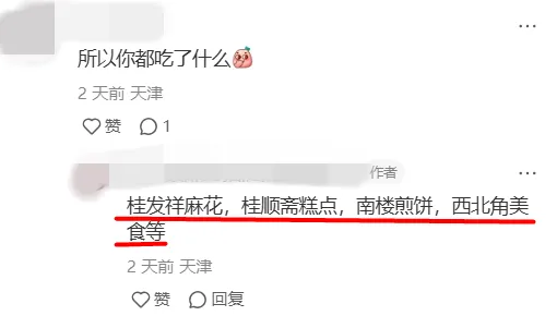 “耳朵眼炸糕、古香齋刨冰、西北角羊雜、南市小糕點,你要來不及吃,姐姐們還能給你打包帶走,説路上吃,用隔温袋裝着,説讓你知道嘛叫玩意兒。”