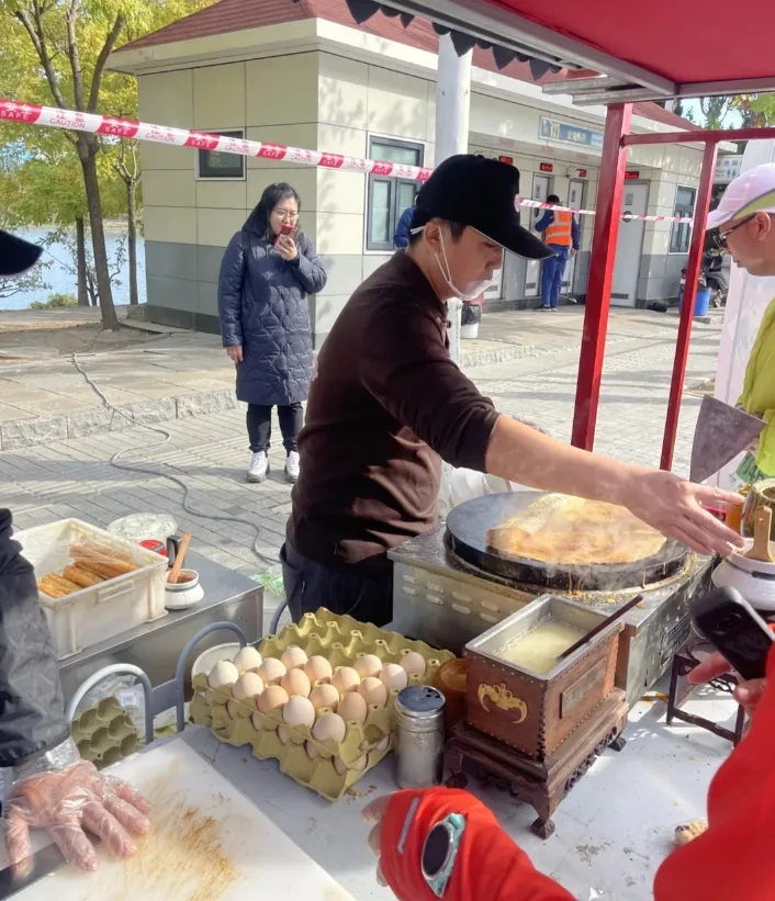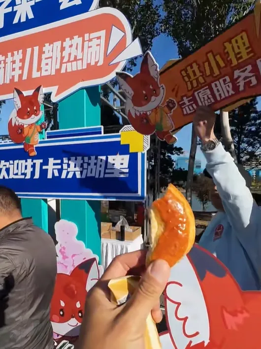 “當然,火腿腸得是本地的,一些比較機靈的選手,會在迎賓二廠的攤位領取玫瑰紅腸,然後到前面的煎餅果子攤排隊,加進去。”