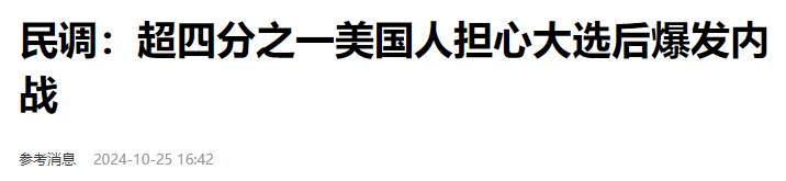 10月23日,英國《泰晤士報》報道,根據《泰晤士報》的民調顯示,超過四分之一的美國人認為,今年總統大選後可能爆發內戰。報道稱,輿觀調查公司在10月18日至21日對1266名登記選民進行調查後發現,有28%的哈里斯支持者和27%的特朗普支持者認為,大選至少在一定程度上可能導致內戰。