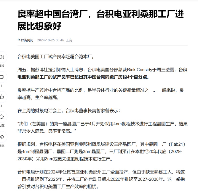 3.魏哲家不説台積電美國廠何時量產,是否已經準備好了量產,他説良率勝過台灣4個百分點,良率試產和量產根本不是一回事,試產大量專業人員盯着,情況較好,量產就是普通工人,良率有下降那是正常的。而且到底良率如何?是不是真的,這個全世界無人能驗證,也沒有人去查兩個廠的真實良率,那還不是聽魏哲家説多少就是多少,他總要説點鼓舞人心的消息,對資本市場一個交代,也對美國政府一個交代。良率高了4%,那就生產成本能降嗎?生產成本能低於台灣嗎?結果其實依然是市場沒有擴大,轉到美國生產,就是生產成本大大提升了,而台灣廠沒活幹了。