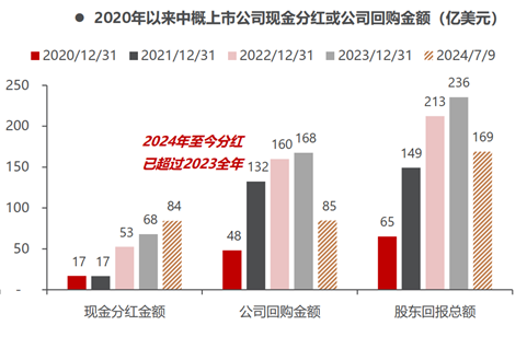 根據民生證券統計的全部中概上市公司股東回報數據,可以看到在轉型之後的2021年開始,中國互聯網公司就開始了注重股東回報,2021年超出2020年1倍多,後續兩年繼續增長,而2024年僅上半年,股東回報就達到169億美元,已經達到去年的72%。
