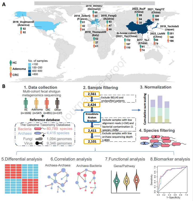 古生菌分佈在多個隊列和分析工作流程的概述(圖源自Gastroenterology )由於在人類腸道中分離和培養古細菌存在困難,因此建議採用散彈槍宏基因組測序來全面分析腸道古細菌,並表徵它們在胃腸道疾病中的潛在作用。先前關於腸道古菌對CRC的貢獻的研究受到隊列規模小和古菌數據庫不完整的限制。一項研究進行了大樣本量的多領域腸道微生物組分析,以瞭解古生菌在結直腸癌中的分佈。然而,細菌和古細菌之間的相互作用以及健康對照-腺瘤-CRC序列中古細菌組成和功能的改變仍有待全面破譯。在這項研究中,作者進行了一項多隊列分析,包括10個已發表的隊列(n=2005)和一個內部隊列(n=419),以深入瞭解古細菌與CRC的關係。研究人員觀察到,在不同的隊列中,古細菌沿着健康對照(HC)- 4腺瘤-CRC序列轉移,α多樣性減少,產甲烷古細菌豐富,潛在的古細菌益生菌減少。該研究結果強調了結合古細菌和細菌特徵的通用生物標誌物面板在區分結直腸癌患者和健康個體方面的診斷潛力。