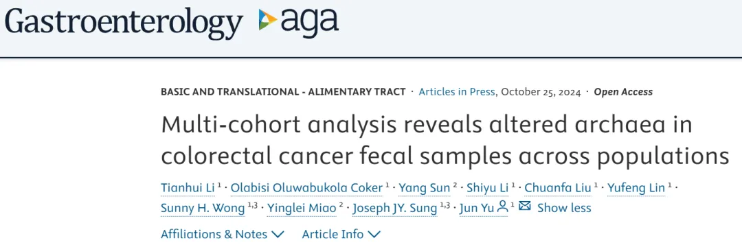 2024年10月25日,香港中文大學於君團隊在Gastroenterology(IF=25.7)在線發表題為”Multi-cohort analysis reveals altered archaea in colorectal cancer fecal samples across populations“的研究論文,該研究利用多隊列分析揭示了人羣中結直腸癌糞便樣本中古細菌的改變。
