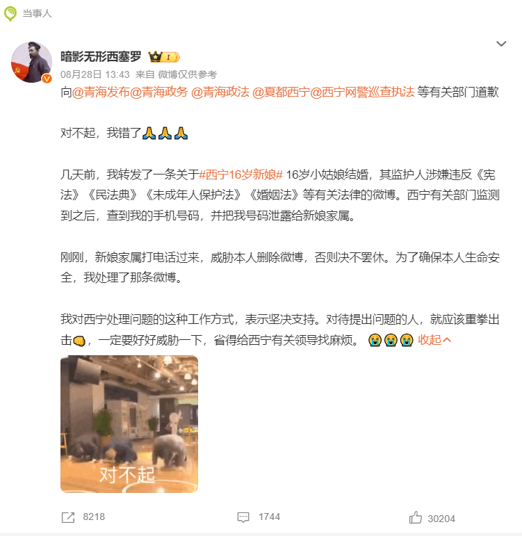 隨後,西塞羅博主被迫發佈一則道歉微博,表達了自己對西寧市某些部門、某些幹部將其個人信息泄露給被舉報人這一違規違紀行為的強烈不滿和憤怒情緒,全文如下圖所示: