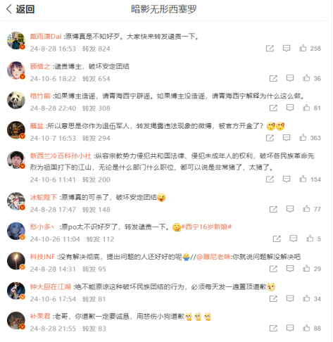 西塞羅博主的微博發佈後,自稱是青海省西寧市湟中區某部門幹部的微博被迅速註銷,查詢其微博UID也已無法打開。