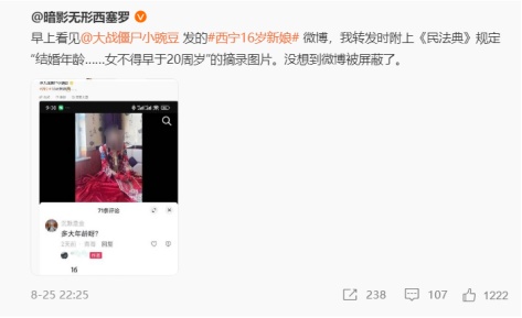 25日晚上,另一位微博博主“暗影無形西塞羅”(以下簡稱“西塞羅”)突然發現早上剛轉發的微博被封禁了,於是忍不住重新發布了一則微博:“早上看見@大戰殭屍小豌豆 發的#西寧16歲新娘# 微博,我轉發時附上《民法典》規定‘結婚年齡……女不得早於20週歲’的摘錄圖片。沒想到微博被屏蔽了。”