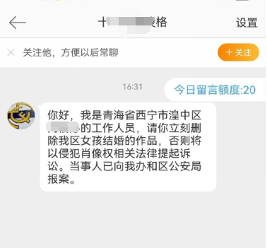 然而,就在該大V發佈微博後不久,突然收到一條網名為“十****格”、IP顯示為青海、自稱青海省西寧市湟中區某部門工作人員的私信。對方稱當事人已經向相關部門報案,要求該網友立即刪除微博,否則將以侵犯肖像權相關法律提起訴訟。