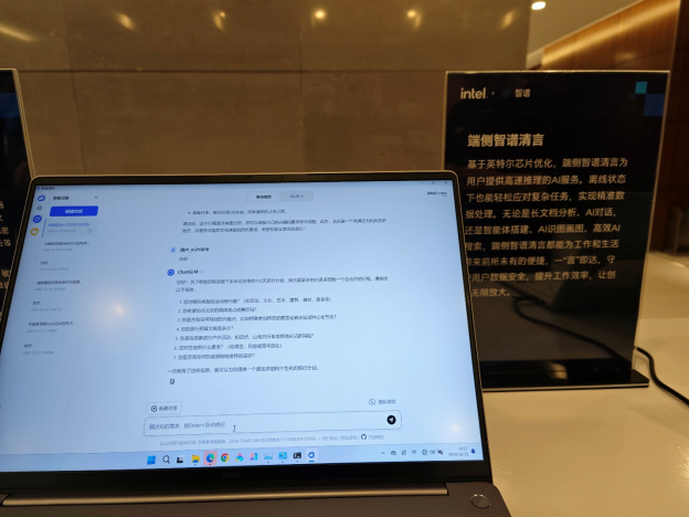 基於英特爾芯片優化,端側智譜清言離線狀態下也能輕鬆應對複雜任務,無論是長文檔分析、AI對話,還是智能體搭建、AI識圖畫圖、高效AI搜索,一“言”即達,守護用户數據安全,提升工作效率,讓創意無限放大。
