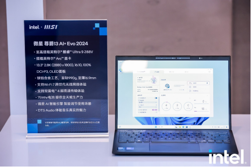 MSI 尊爵13 AI+ Evo 2024在僅有990g的13寸機身塞下了2.8K、100%DCI-P3 OLED屏幕,雙雷電4,Wi-Fi 7網卡,75Whr大電池,結合能效比飛昇的第二代酷睿Ultra處理器,實現超輕便攜,超長續航,超強生產力。