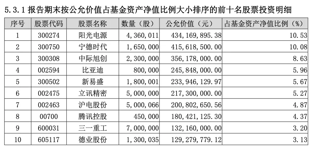 根據最新公佈的2024年三季報,這隻基金前10大重倉股,既包括今年熱度很高的中際旭創、新易盛這樣非常有衝勁的牛股,也有陽光電源、寧德時代、滬電股份、徐工集團這樣相對穩健的行業龍頭。